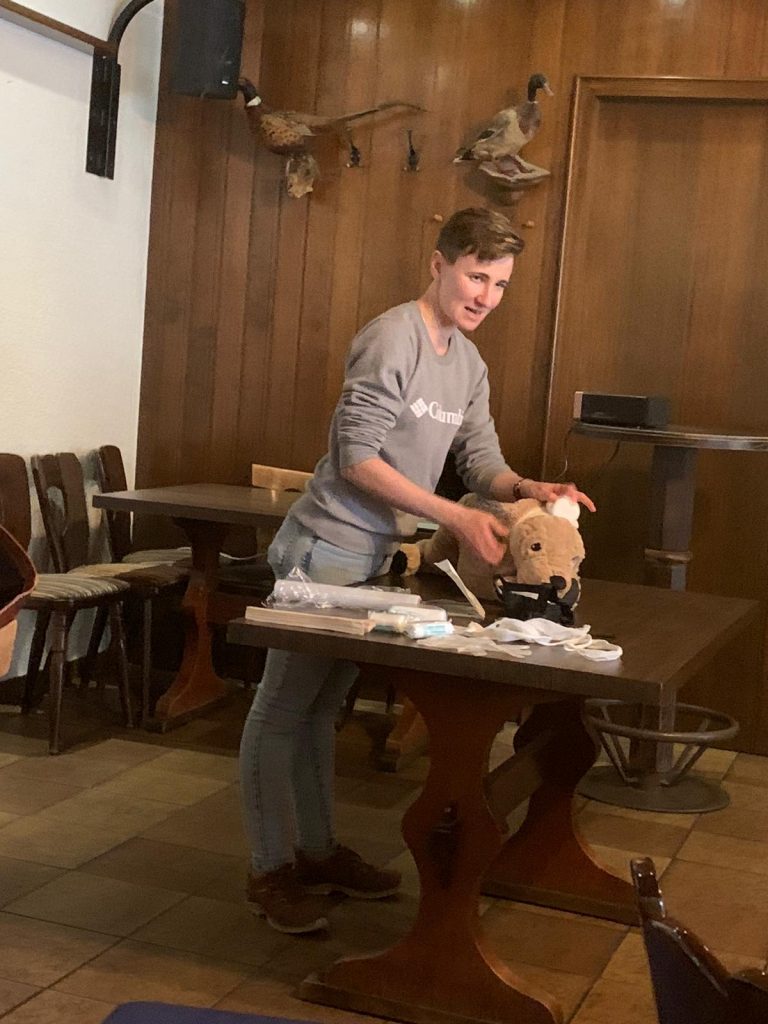 Im Jagdbetrieb, besonders auf der Nachsuche und bei den Drückjagden sind die vierläufigen Helfer einem hohen Verletzungsrisiko ausgesetzt. Was in einem solchen Fall zu tun ist hat Miriam Loos erläutert. Darüber hinaus sollten sämtliche Jagdausübende diesen Kurs besuchen, da zu jeder Zeit einer Jagd die Möglichkeit besteht, dass ein verletzter Jagdhund einen Jäger anläuft.